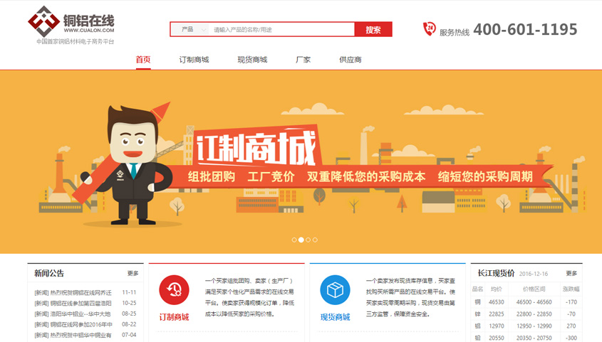銅鋁在線為有色金屬行業(yè)的電子商務(wù)交易平臺(tái),采用系統(tǒng)自動(dòng)組批團(tuán)購(gòu)的方式,將需求相同的客戶組批給統(tǒng)一廠家競(jìng)價(jià),以組團(tuán)形式在降低買家采購(gòu)成本的同時(shí)降低工廠的生產(chǎn)成本。平臺(tái)同時(shí)提供現(xiàn)貨采購(gòu)模式,供用戶實(shí)現(xiàn)快速線上交易。