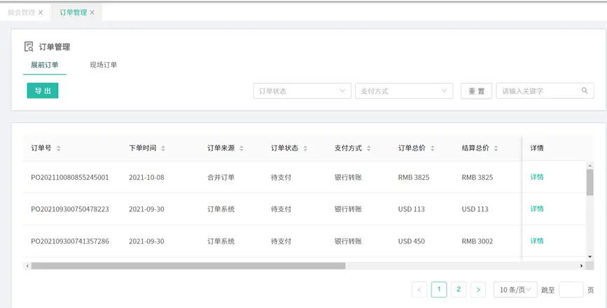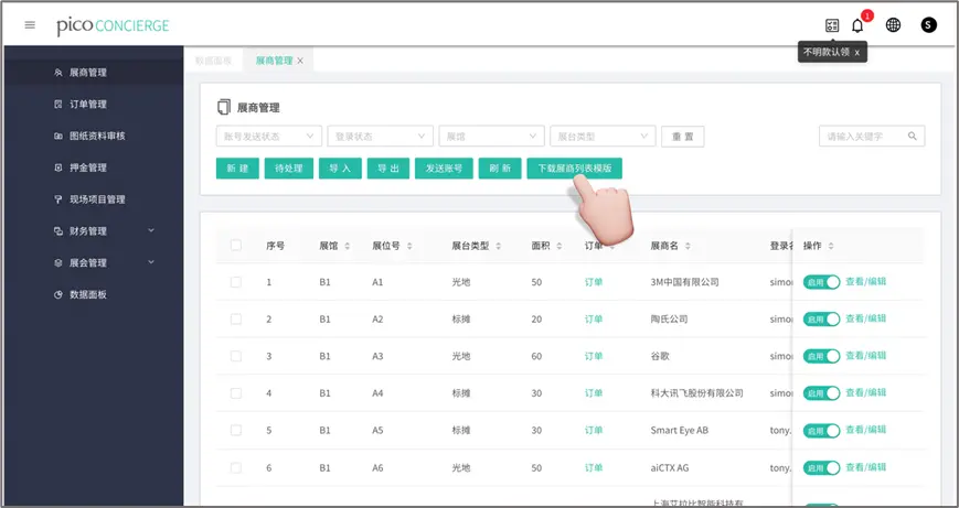 展商管理:導(dǎo)入?yún)⒄股虜?shù)據(jù)、新建展商、啟用禁用展商、導(dǎo)出展商信息